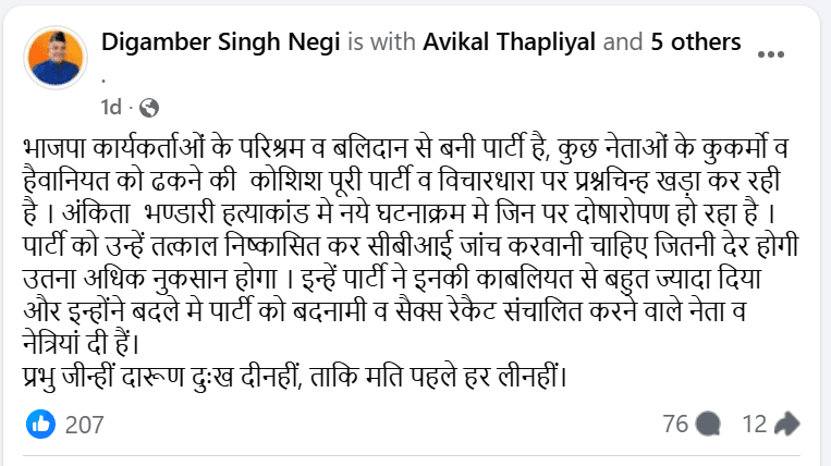 RSS पृष्ठभूमि से जुड़े वरिष्ठ नेता और भाजपा पंचायत प्रकोष्ठ के पूर्व प्रदेश संयोजक दिगंबर सिंह नेगी ने अपनी फेसबुक पोस्ट में कथित रूप से आरोपित नेताओं को तत्काल पार्टी से निष्कासित करने और मामले की सीबीआई जांच की मांग की। उन्होंने लिखा कि भाजपा कार्यकर्ताओं के परिश्रम और बलिदान से बनी पार्टी है, और कुछ नेताओं के कुकर्मों को ढकने की कोशिश पूरी पार्टी और विचारधारा पर प्रश्नचिह्न खड़ा कर रही है। नेगी की इस पोस्ट पर कई भाजपा कार्यकर्ताओं ने समर्थन में टिप्पणी भी की है।